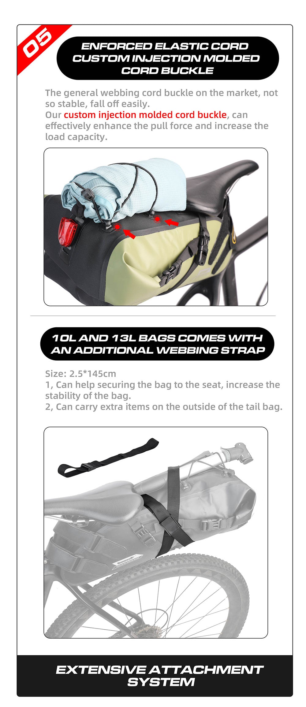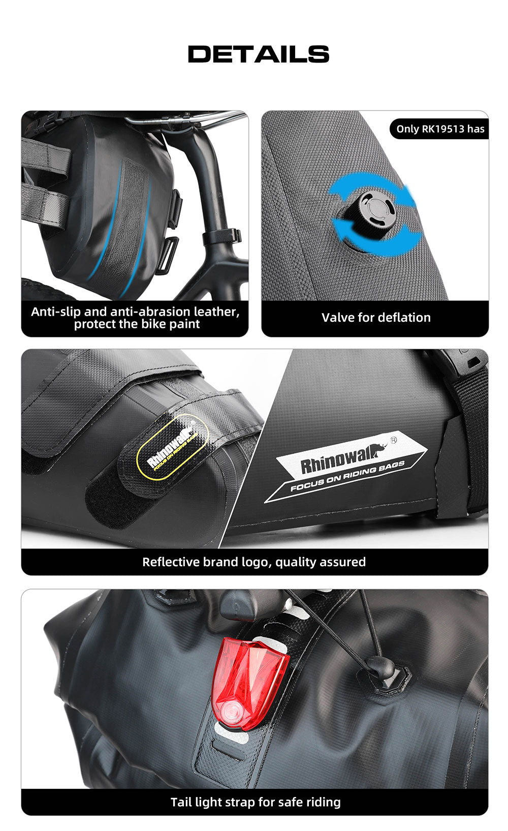 Product form product-banner Rhinowalk Official Store 5/10/13L Waterproof Bicycle Bikepacking Share WhatsApp Deel X Pin it Messenger Email -10% off all products with the code Happy Xmas Size Size chart 5L saddle bag 10L saddle bag-Black 13L saddle bag-Black Saddle Bag Stabilizer 10L Saddle Bag-Olive 13L Saddle Bag-Olive SKU: RK19512B $31.01 77 in stock Quantity Add to cart This item is a recurring or deferred purchase. By continuing, I agree to the cancellation policy and authorize you to charge my payment method at the prices, frequency and dates listed on this page until my order is fulfilled or I cancel, if permitted. Guaranteed secure & safe checkout. Fast shipping1 Year Warranty