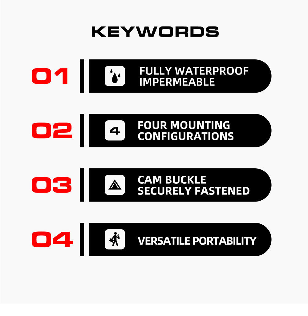 • [CAM BUCKLE SECURELY FASTENED] Compared with other bags on the market, we use straps equipped with cam buckles to ensure that the tension is maintained. When riding off roads, if not fasten firmly, webbings need to be retightened frequently due to the bumps caused loosening. But with cam buckles, when locked, it can prevent the webbing from loosening.