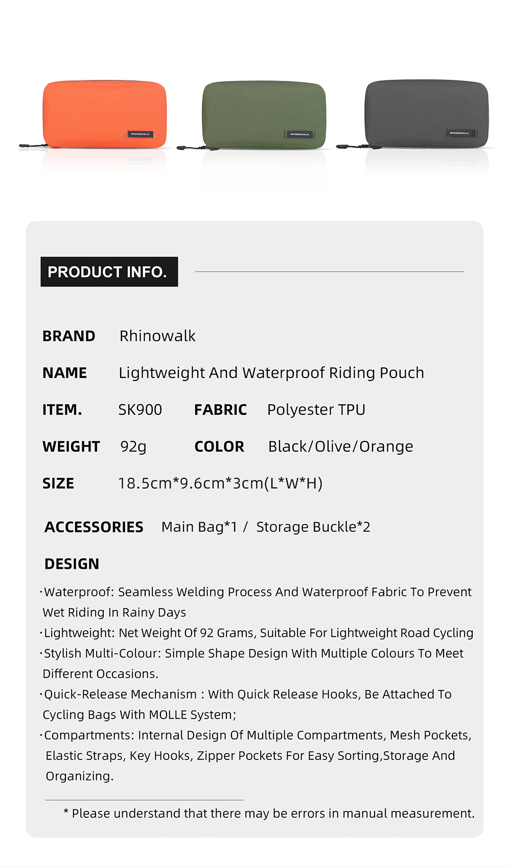 Product form product-banner Rhinowalk Official Store Essential Waterproof Cycling Pouch Share WhatsApp Deel X Pin it Messenger Email ColorOrange SKU: SK900RG $27.25 90 in stock Quantity Add to cart This item is a recurring or deferred purchase. By continuing, I agree to the cancellation policy and authorize you to charge my payment method at the prices, frequency and dates listed on this page until my order is fulfilled or I cancel, if permitted. Guaranteed secure & safe checkout. Fast shipping1 Year Warranty