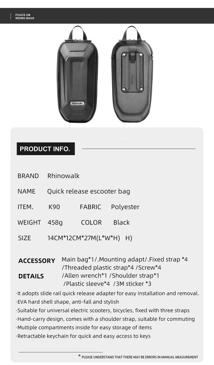 Product form product-banner Rhinowalk Official Store Quick Release Escooter Bag Share WhatsApp Deel X Pin it Messenger Email SKU: K90BK $23.49 84 in stock Quantity Add to cart This item is a recurring or deferred purchase. By continuing, I agree to the cancellation policy and authorize you to charge my payment method at the prices, frequency and dates listed on this page until my order is fulfilled or I cancel, if permitted. Guaranteed secure & safe checkout. Fast shipping1 Year Warranty