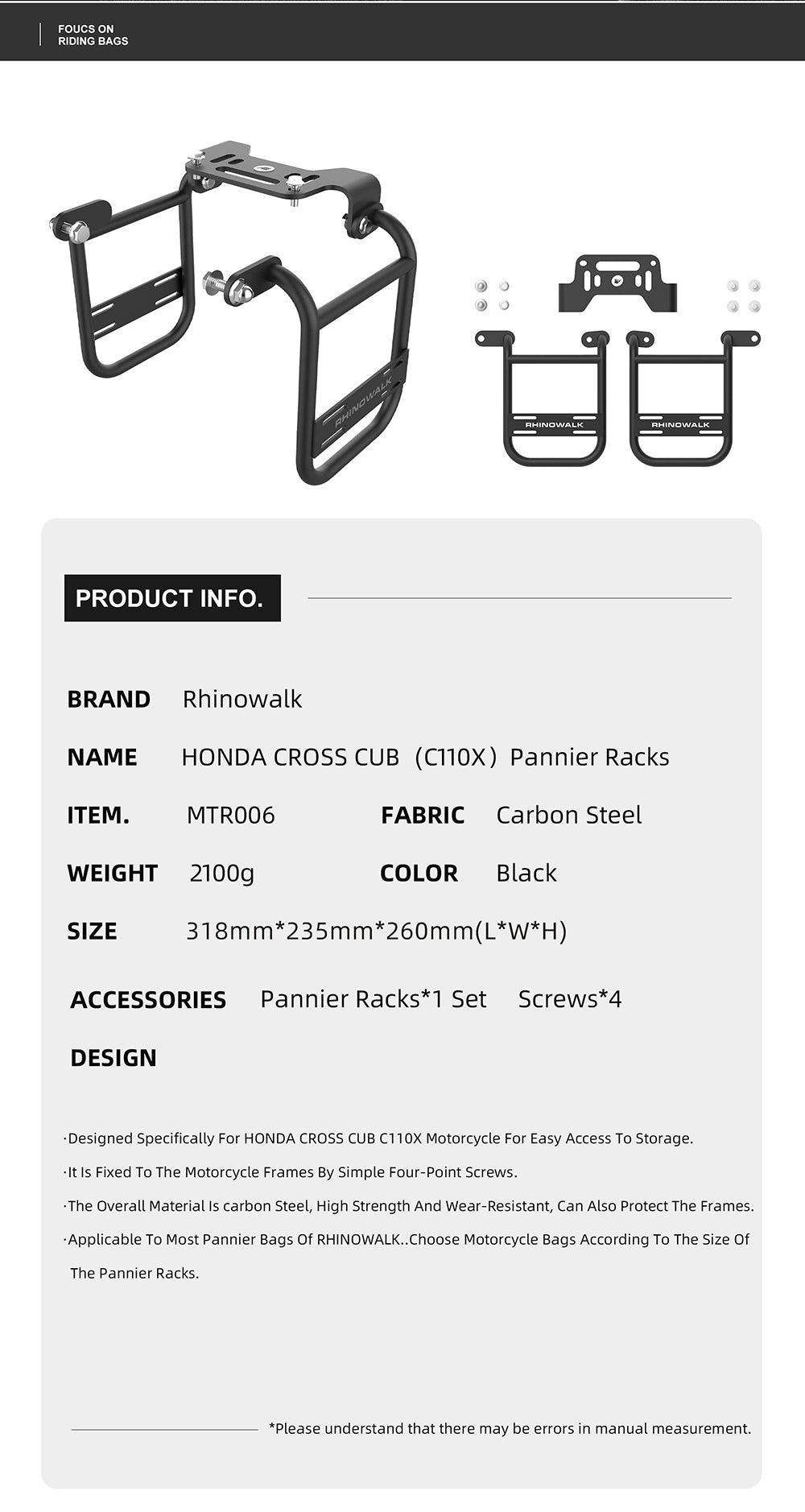 Product form product-banner Rhinowalk Official Store Side racks for Honda Cub C110X Share WhatsApp Deel X Pin it Messenger Email -10% off all products with the code Happy Xmas SKU: MTR006BK $62.03 96 in stock Quantity Add to cart This item is a recurring or deferred purchase. By continuing, I agree to the cancellation policy and authorize you to charge my payment method at the prices, frequency and dates listed on this page until my order is fulfilled or I cancel, if permitted. Guaranteed secure & safe checkout. Fast shipping1 Year Warranty