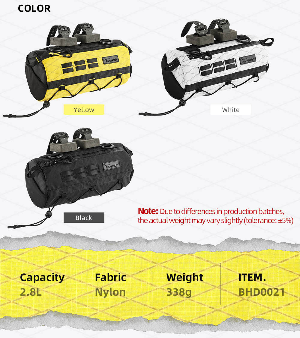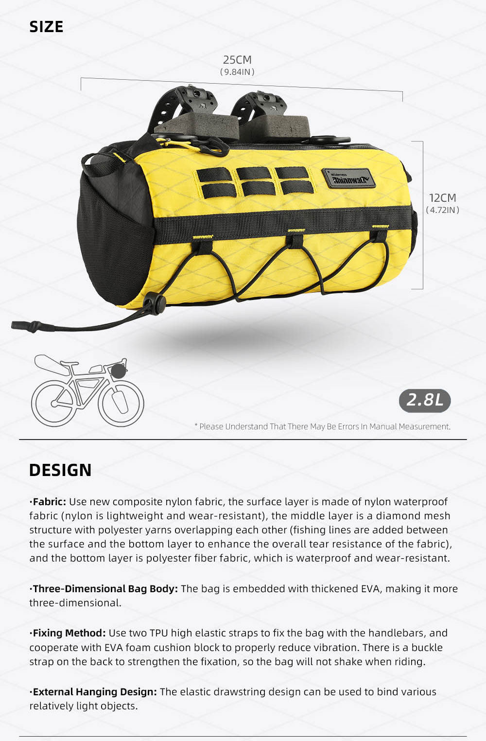Product form Vendor Rhinowalk Official Store Wilderness Series x 2.8l Handlebar bag Vendor Share WhatsApp Deel X Pin it Messenger Email -10% off all products with the code Thanksgiving day ColorYellow $38.99 98 in stock Quantity Add to cart This item is a recurring or deferred purchase. By continuing, I agree to the cancellation policy and authorize you to charge my payment method at the prices, frequency and dates listed on this page until my order is fulfilled or I cancel, if permitted. Guaranteed secure & safe checkout. Fast shipping1 Year Warranty