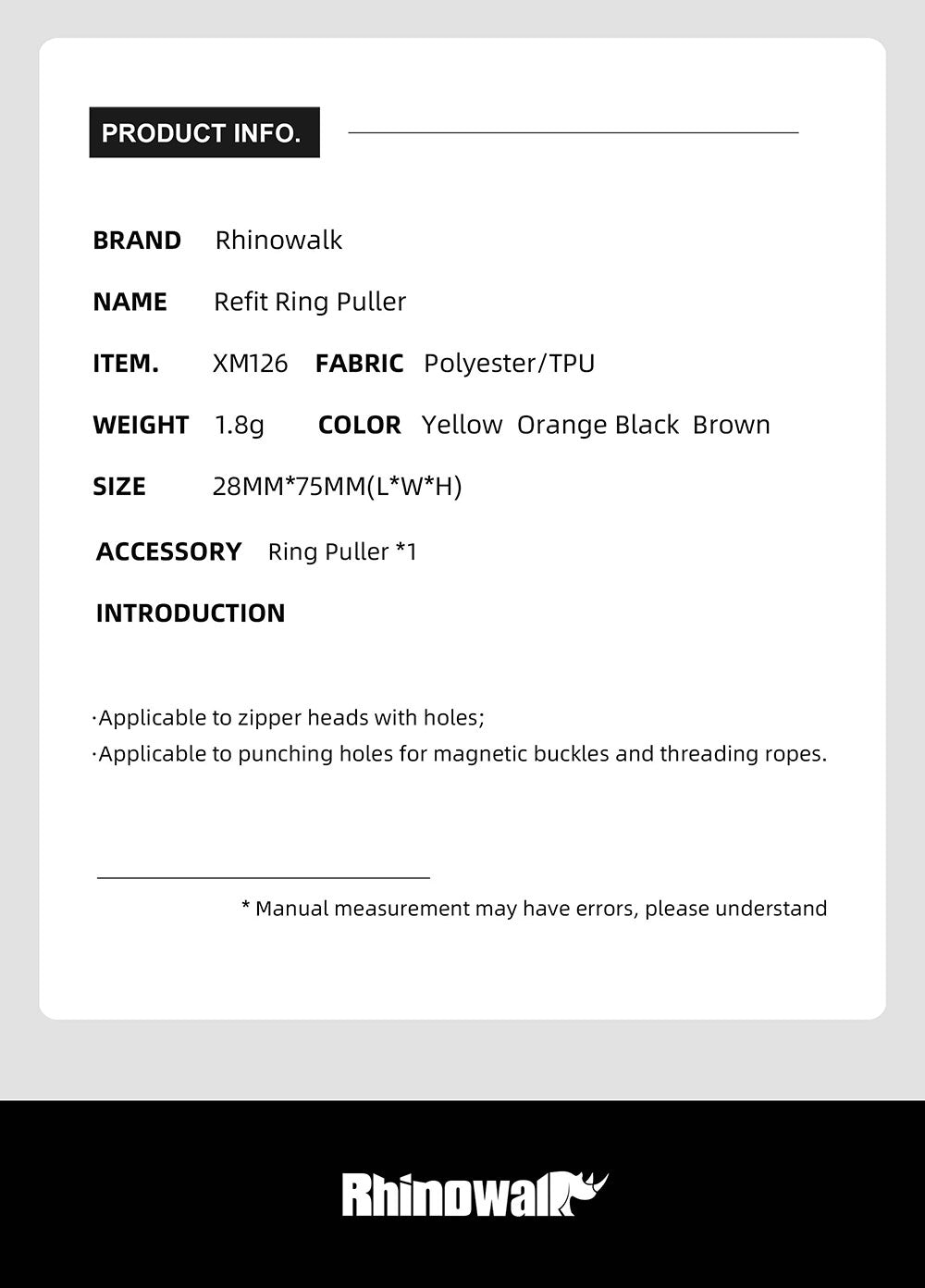 Product form product-banner Rhinowalk Official Store Zipper puller Share WhatsApp Deel X Pin it Messenger Email ColorBlack *5 SKU: XM126BK $4.69 81 in stock Quantity Add to cart This item is a recurring or deferred purchase. By continuing, I agree to the cancellation policy and authorize you to charge my payment method at the prices, frequency and dates listed on this page until my order is fulfilled or I cancel, if permitted. Guaranteed secure & safe checkout. Fast shipping1 Year Warranty